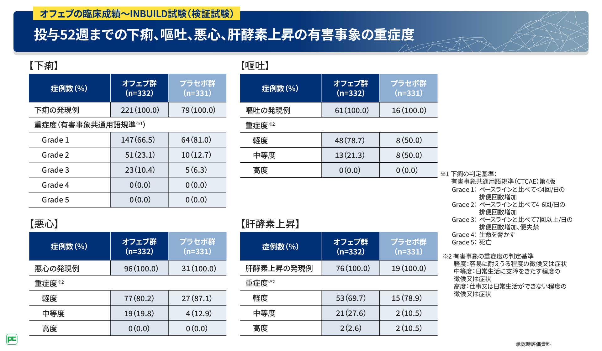 続いて、投与52週までの下痢、嘔吐、悪心、肝酵素上昇の有害事象の重症度をお示しします。オフェブ群において、下痢は、有害事象共通用語規準を用いた評価ではGrade 1が66.5%、Grade 2が23.1%、Grade 3が10.4%でした。嘔吐と悪心、肝酵素上昇は有害事象の重症度の判定基準を用いて評価しています。嘔吐は軽度が78.7%、中等度が21.3%、悪心は軽度が80.2%、中等度が19.8%でした。肝酵素上昇は軽度が69.7%、中等度が27.6%、高度が2.6%でした(図13)。