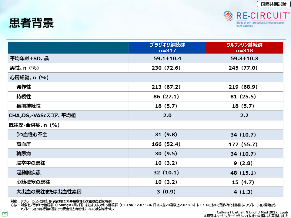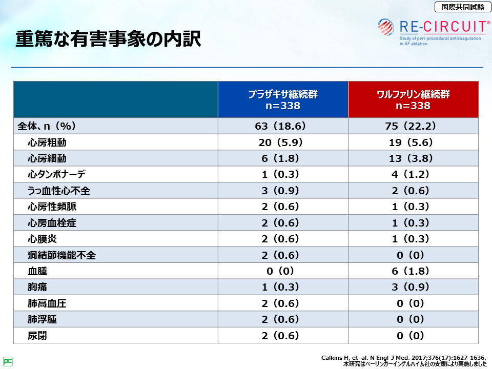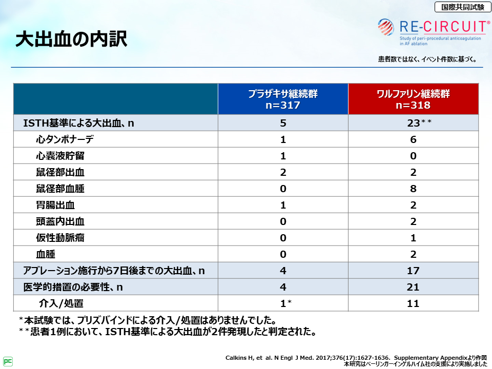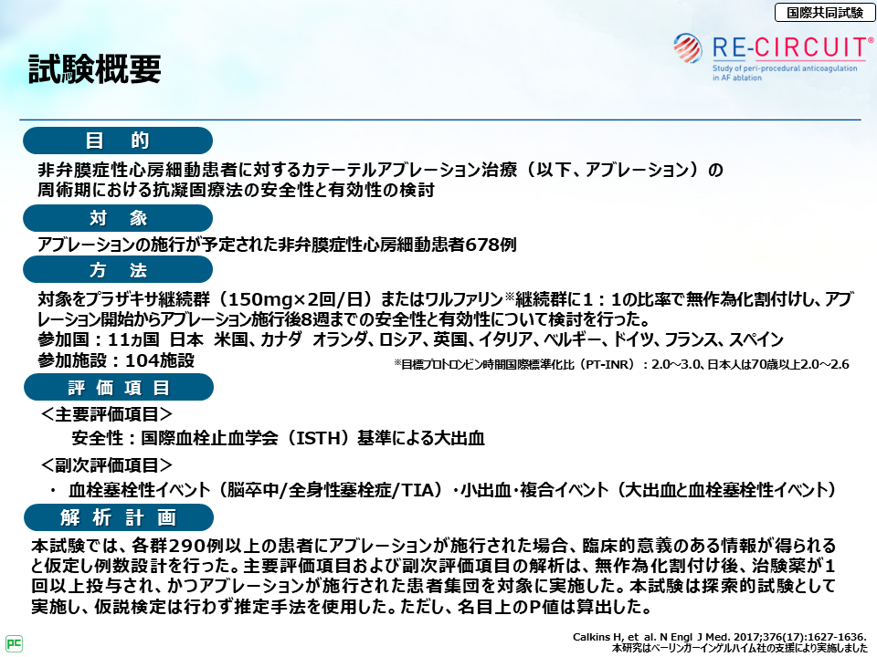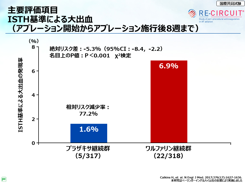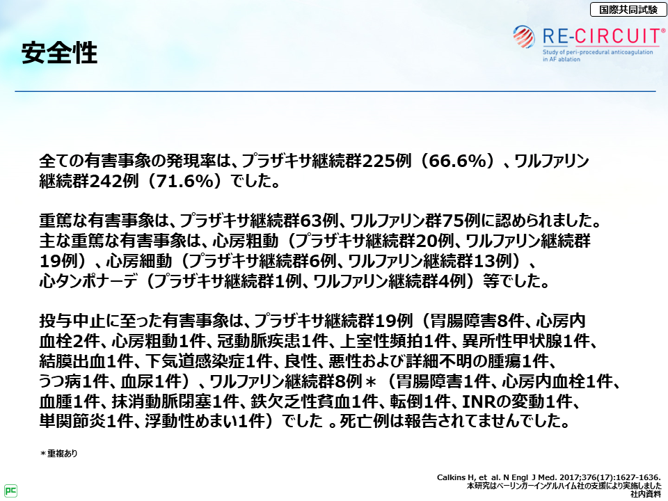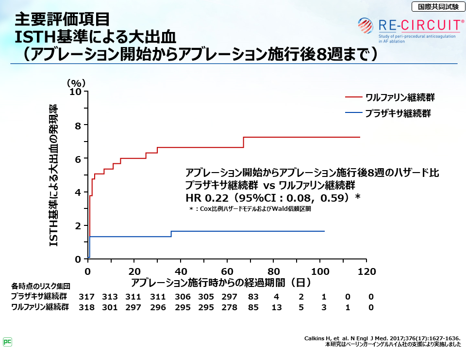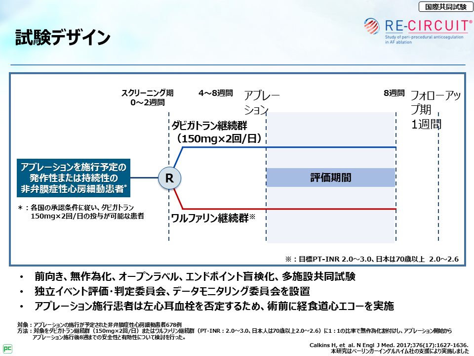 それから、RE-CIRCUIT試験で特に大事な点は、アブレーション当日および施行後8週までのプラザキサ®継続投与の安全性・有効性が検討されている点だよ。」