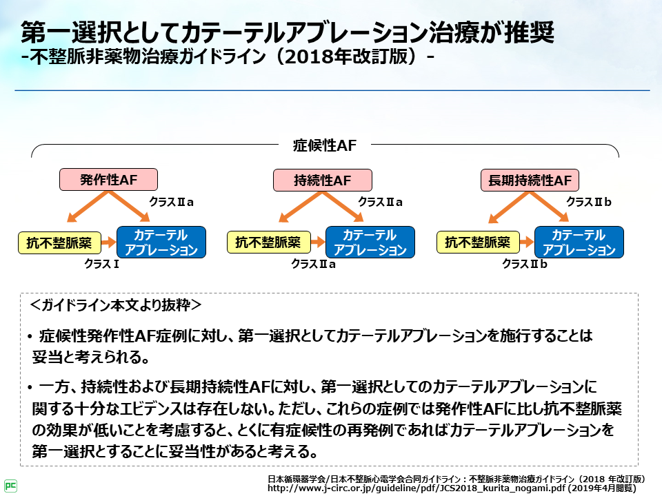 近年、AFに対するアブレーションの有用性が評価され、2018年より症候性発作性AF患者さんに対する第一選択の治療法としてアブレーションがガイドラインで推奨されるようになりました(図2)。
