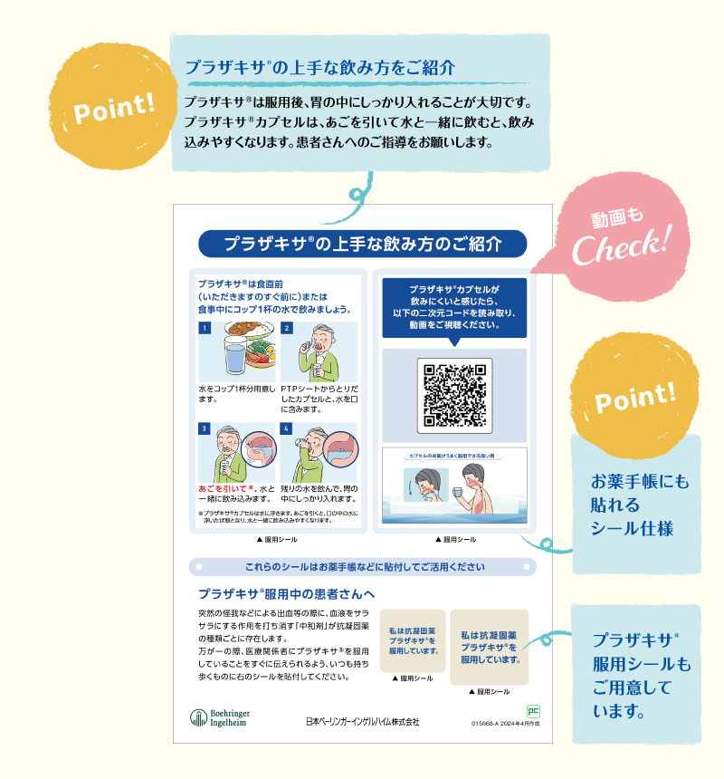プラザキサ®を服用する患者さんのために、プラザキサ®の上手な飲み方について解説した動画「プラザキサ®を上手に服用するために」(字幕付き、約4分)をご用意しました。指導箋の裏面の二次元コードからアクセスすることが可能です。