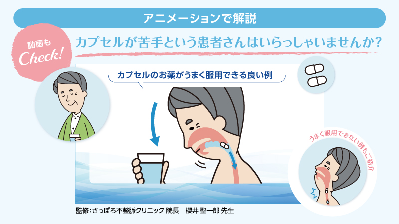 プラザキサ®は服用後、胃の中にしっかり入れることが大切です。プラザキサ®カプセルは、あごを引いて水と一緒に飲むと、飲み込みやすくなります。是非、患者さんへのご指導をお願いします。