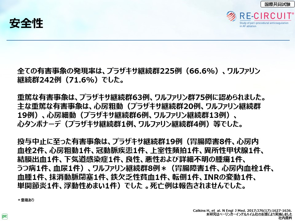 主な重篤な有害事象は、心房粗動(プラザキサ継続群20例、ワルファリン継続群19例)、心房細動(プラザキサ継続群6例、ワルファリン継続群13例)、心タンポナーデ(プラザキサ継続群1例、ワルファリン継続群4例)等でした。