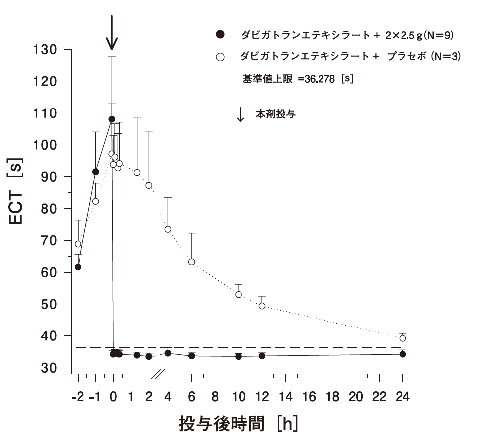 - ダビガトランの定常状態にある(ダビガトランエテキシラートとして220mgを1日2回投与)日本人健康成人男性9例に本剤5gを15分間隔で2回に分けて5分間静脈内投与したときの血漿中非結合型総ダビガトラン濃度時間推移及び血液凝固マーカー(dTT、ECT及びaPTT)の平均作用-時間推移を以下に示す(各推移の0時間時点はイダルシズマブ又はプラセボの1回目の投与終了に該当)。なお、日本人を対象とした第Ⅰ相試験のベースライン値から算出した「平均値+2×SD」を血液凝固マーカーの基準値上限とした5)。