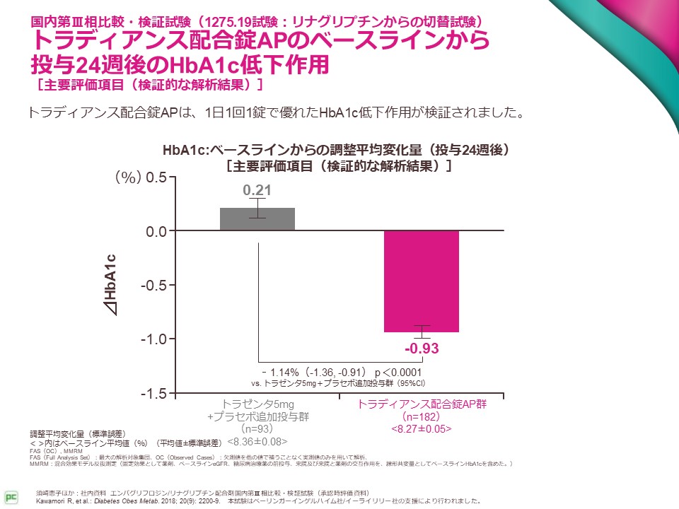 主要評価項目である投与24週後におけるHbA1cのベースラインからの調整平均変化量は、トラゼンタ5mg+プラセボ群の+0.21%と比較して、トラディアンス配合錠AP群では-0.93%と有意な低下が認められ、その差は1.14%でした。