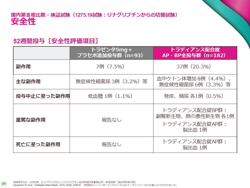 本試験の52週間投与における副作用発現割合は、トラディアンス配合錠AP・BP全投与群で20.3%(37/182例)、トラゼンタ5mg+プラセボ追加投与全投与群で7.5%(7/93例)でした。