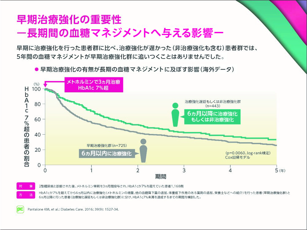 早期から適切な治療強化をすることが、将来の良好な血糖マネジメントにつながることが示唆されます。