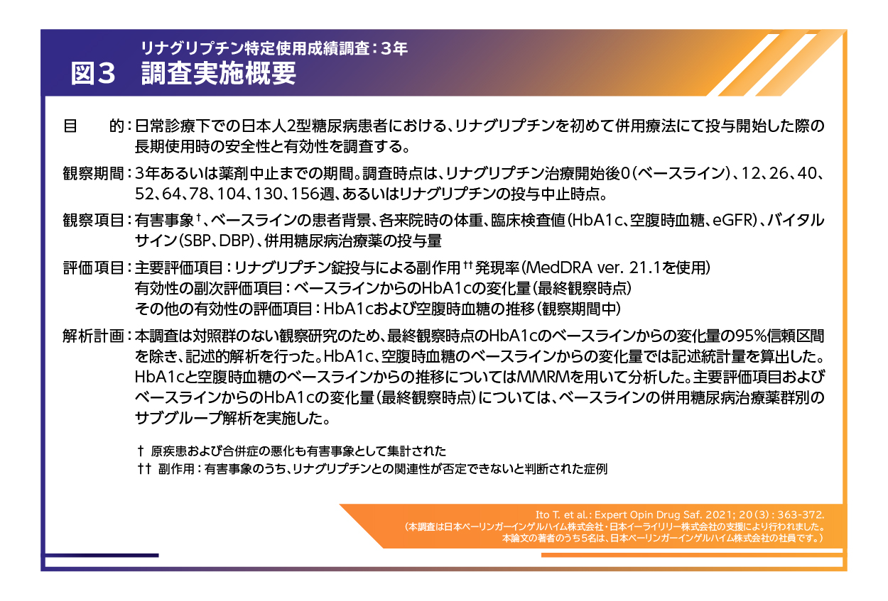 - Ito T. et al. Expert Opin Drug Saf. 2021; 20: 363-72. (本調査はベーリンガーインゲルハイム社および日本イーライリリー株式会社の支援で行われました。本論文の著者のうち5名は、日本ベーリンガーインゲルハイム社の社員です。)