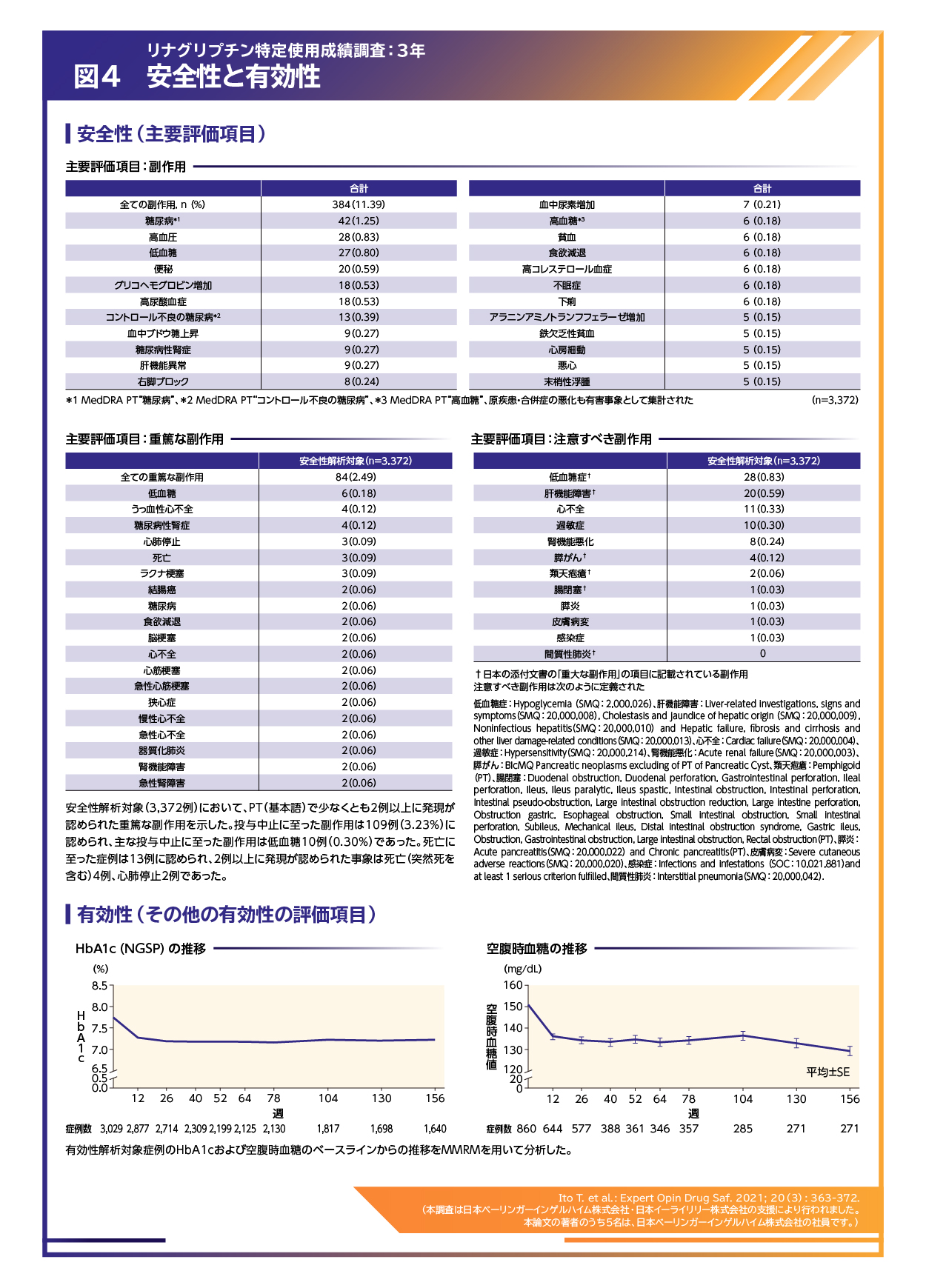 2型糖尿病を有する日本人においてトラゼンタ®併用療法の安全性や有効性を検討した3年間の特定使用成績調査(図3)では、副作用は11.39%(384例/3,372例)に認められ、主な副作用は糖尿病の悪化(1.25%、42例)、高血圧(0.83%、28例)、低血糖(0.80%、27例)などでした。重篤な副作用は2.49%(84例)、投与中止に至った副作用は3.23%(109例)、死亡に至った症例は3.9%(13例)でした(図4)。また、トラゼンタ®併用療法により、HbA1cと空腹時血糖は図4のとおり推移し、HbA1cの変化量は-0.49±1.33%(95%CI:-0.54~0.44%;ベースライン7.76±1.37%、最終観察時点7.26±1.19%)、空腹時血糖の変化量は-15.27±59.96mg/dL(同:-19.54~-11.00mg/dL;151.68±52.20mg/dL、136.72±44.27mg/dL)でした(いずれも平均±SD)3)。
