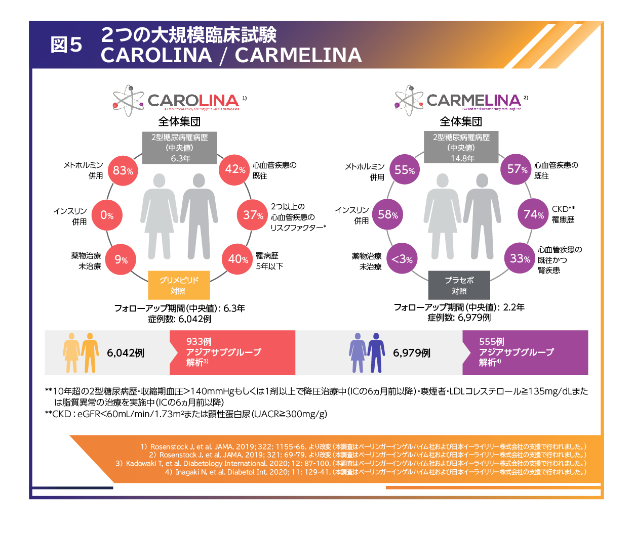 なお、トラゼンタ®では心血管疾患の既往もしくは心血管イベントリスクのある2型糖尿病と診断されて比較的間もない人を対象としたCAROLINA試験、心血管や腎イベント、またはその両方のリスクが高い2型糖尿病を有する人を対象としたCARMELINA試験において、それぞれアジア人サブグループ解析が実施されています。(図5)4)5)。