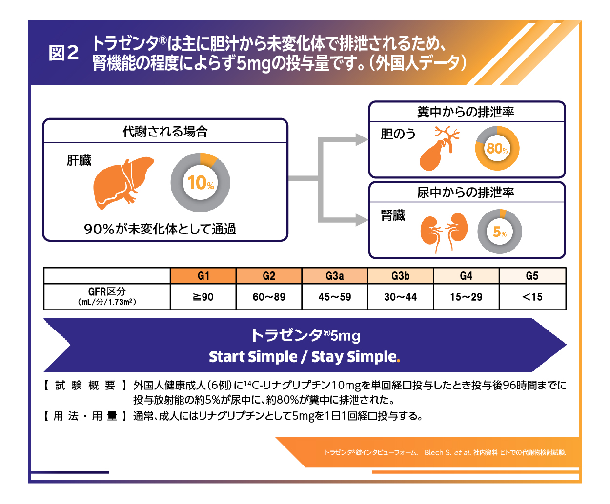 2型糖尿病の薬物療法において、日本ではDPP-4阻害薬が多く用いられています4)。DPP-4阻害薬の一つであるトラゼンタ®は主に胆汁から未変化体で排泄されるため、腎機能の程度によらず1日1回1錠5mgの投与で治療を行うことが可能です(図2)5)6)。