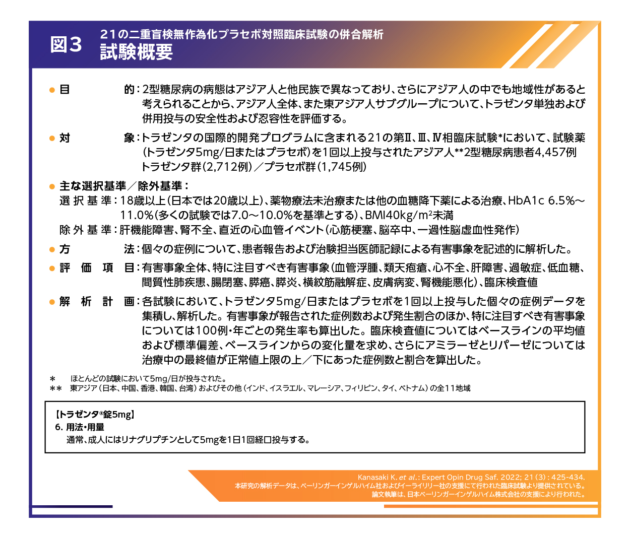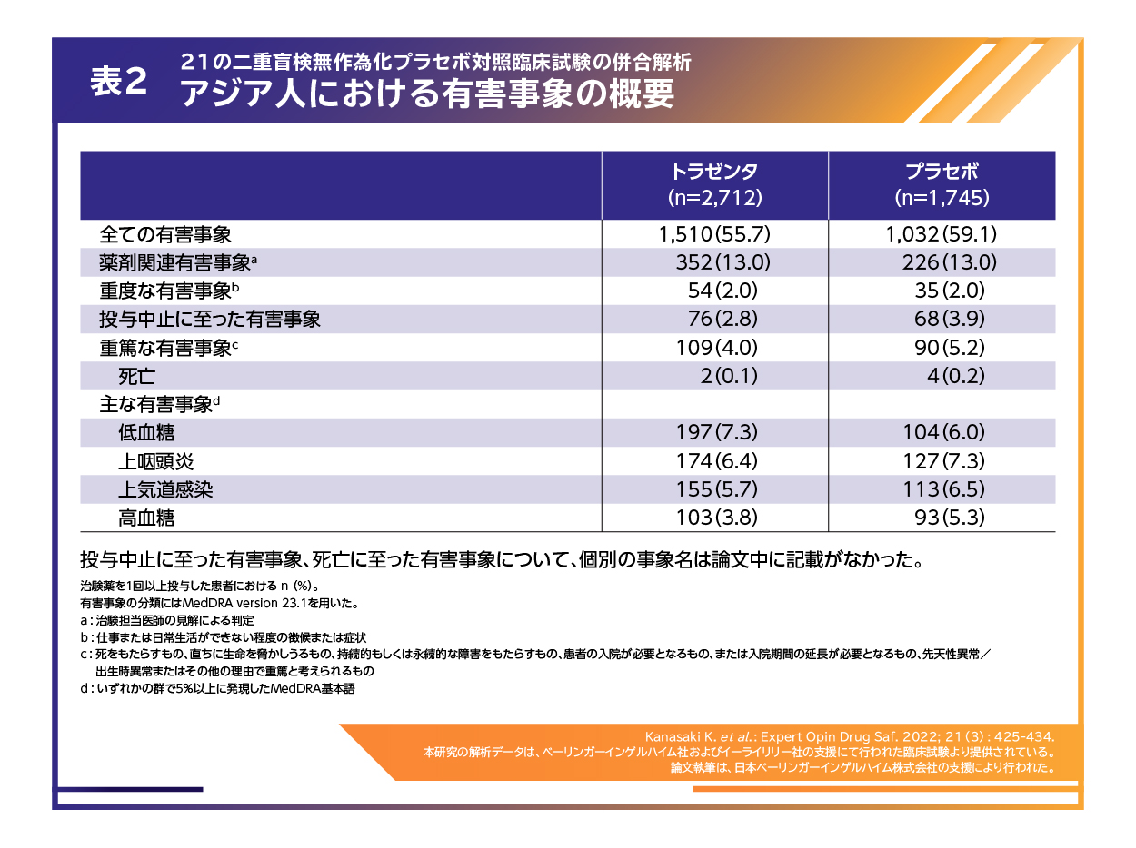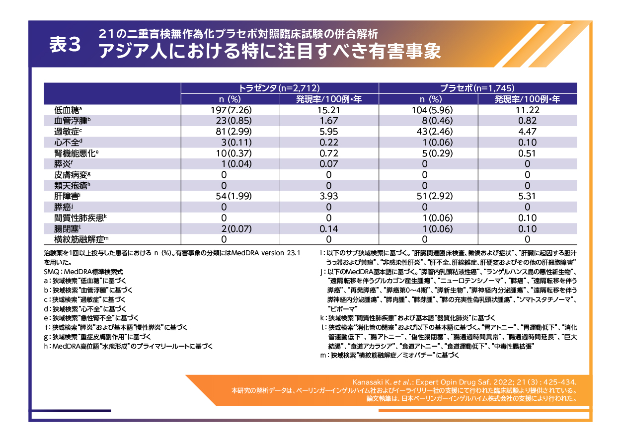 また、トラゼンタ®では、これまでに実施された21の二重盲検無作為化プラセボ対照臨床試験における、アジア人全体、また東アジア人サブグループについて、トラゼンタ®単独および併用投与の安全性および忍容性を評価した併合解析の結果が報告されています(図3)7)。