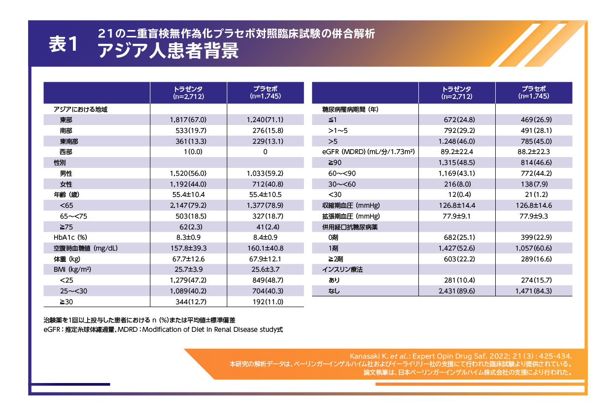 解析対象は、アジア人2型糖尿病患者4,457例(トラゼンタ®群2,712例、プラセボ群1,745例)で、東アジア人の割合はトラゼンタ®群で67.0%、プラセボ群で71.1%でした(表1)。