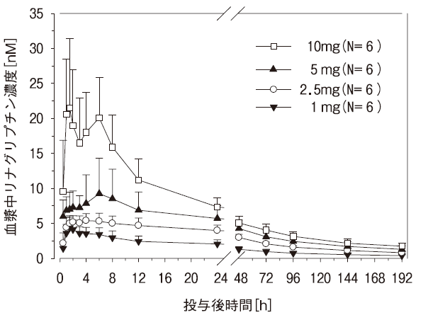 日本人健康成人男性に、本剤1、2.5、5、10mgを空腹時単回経口投与したとき注)の血漿中濃度推移を図1に、血漿中未変化体の薬物動態パラメータを表1に示す。Cmax及びAUC0-tzは用量比以下の上昇を示した。1)