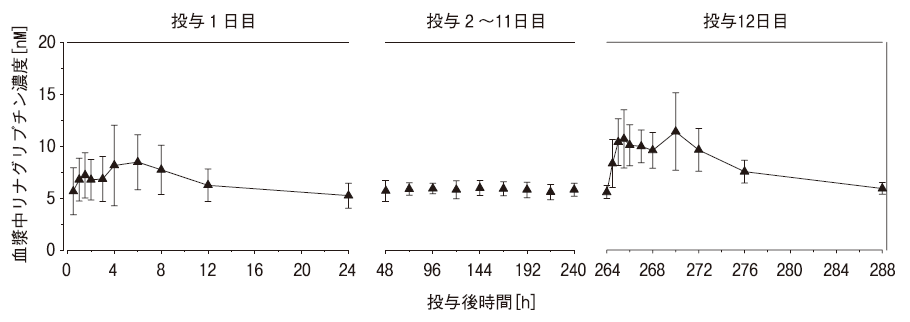 (2)リナグリプチンの持つ薬物動態特性により、血漿中のDPP-4活性に対する阻害作用(80%以上)は24時間持続する1)。