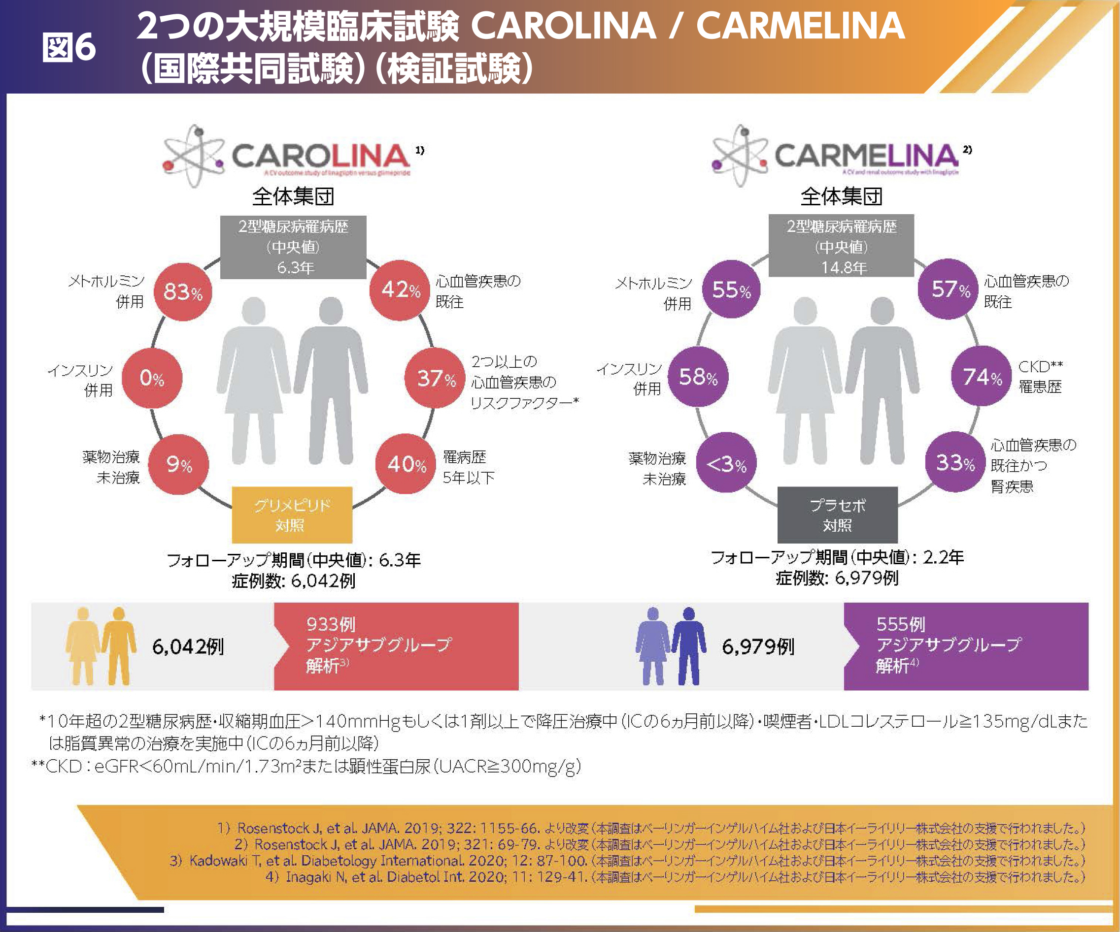 また、トラゼンタ®は、心血管疾患の既往もしくは心血管イベントリスクのある早期2型糖尿病のある方を対象としたCAROLINA試験、心血管や腎イベント、またはその両方のリスクが高い2型糖尿病のある方を対象としたCARMELINA試験において、それぞれアジア人サブグループ解析が実施されています(図6)7)8)。