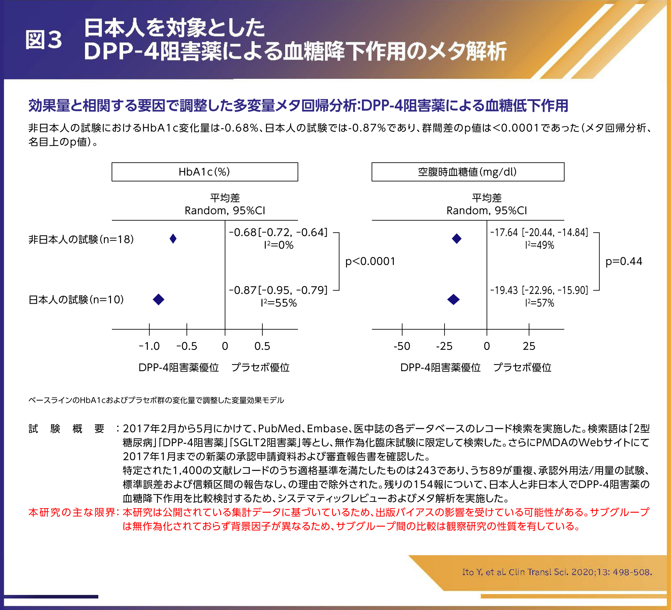 また、日本人で2型糖尿病のある方と日本人以外で2型糖尿病のある方のDPP-4阻害薬の効果を検討したメタ解析も実施されており、日本人2型糖尿病のある方におけるDPP-4阻害薬の血糖降下作用は、日本人以外で2型糖尿病のある方と比較して高かったことが示されています(HbA1cの平均変化量:日本人-0.87%、日本人以外-0.68%、p<0.0001[多変量メタ回帰分析]、名目上のp値)(図3)5)。