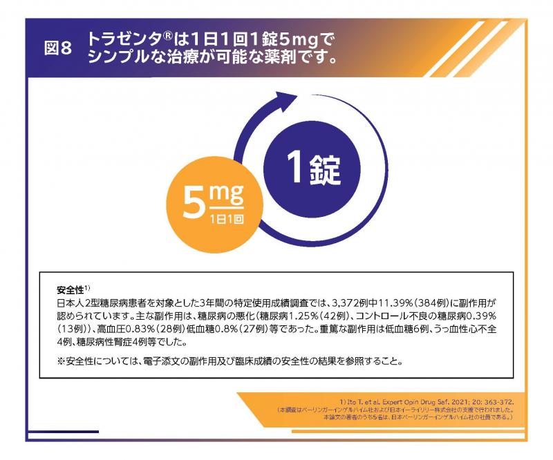 トラゼンタ®は、2型糖尿病のある方において、1日1回1錠5mgでシンプルな治療が可能な薬剤です(図8)。糖尿病治療の選択肢として、トラゼンタ®をご検討いただければ幸いです。